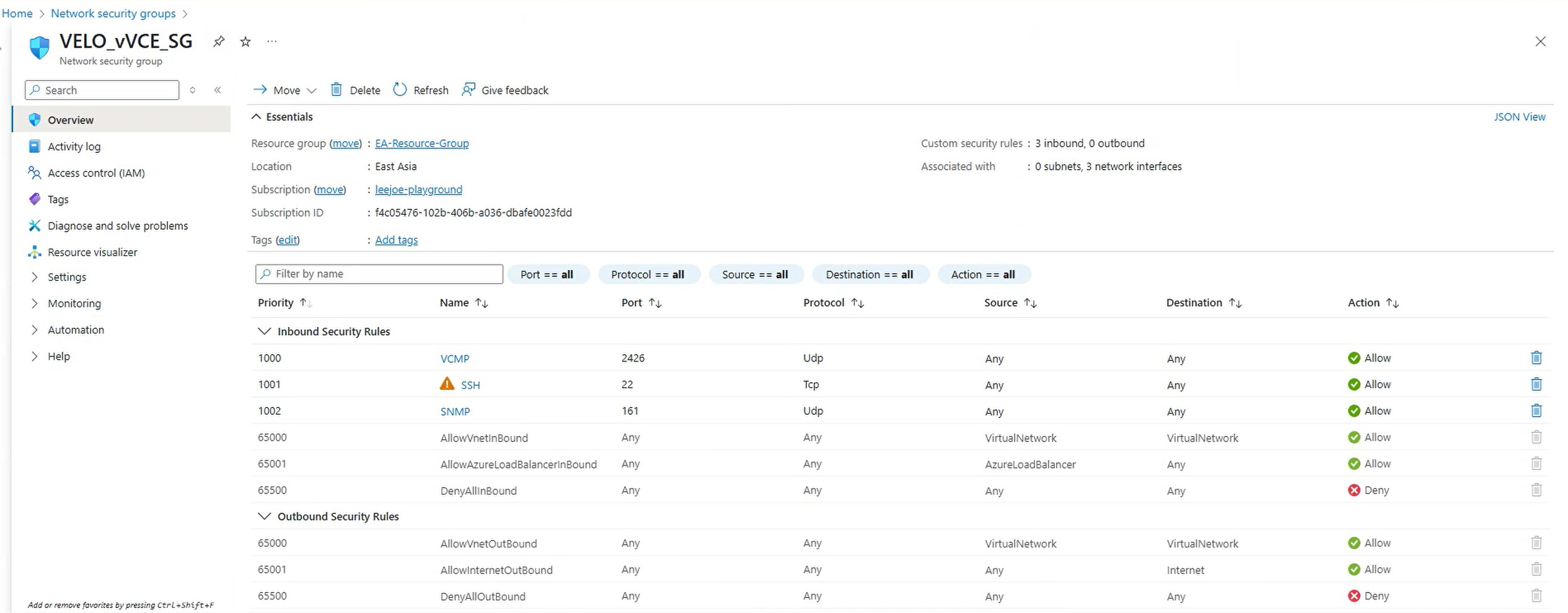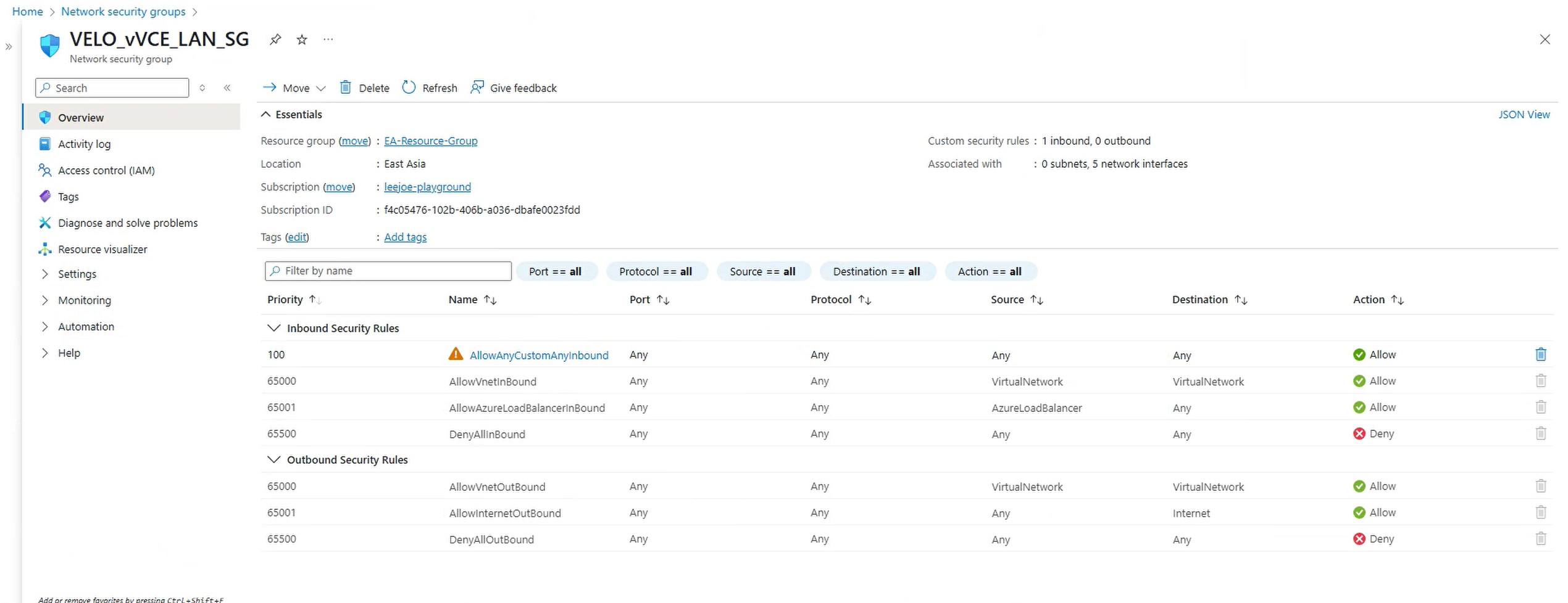 The following is the sample LAN side Network Security Group with name “VELO_vVCE_LAN_SG”: